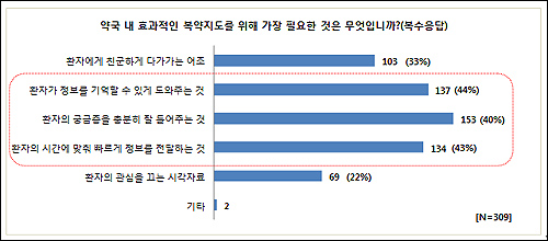 가장 효과적인 복약지도를 위해 필요한 요소를 묻는 질문에는 '환자의 궁금증을 충분히 들어주는 태도'라고 답한 약사가 49%(153명)으로 가장 많았다.