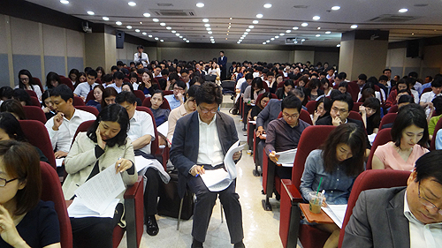 심평원은 직원 교육장 문을 열고 몰려든 제약사 직원들을 안내했다. 행사는 지원된 영상장비 덕에 대강당과 교육장 두 곳에서 진행될 수 있었다.