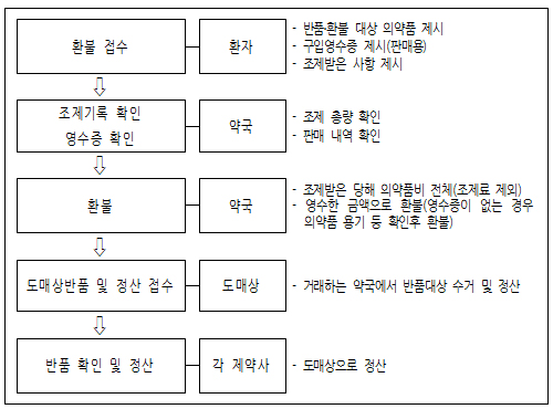 판매용 제품은 영수증 또는 용기(약병, 포장)를 확인한 후 약국판매가로 환불해 주면된다.
