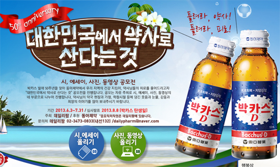 드링크 박카스가 세상에 나온 건 1963년으로 오는 8월8일이면 50주년을 맞게 된다. 박카스는 2012년까지 177억병 팔렸다. 지금 껏 팔린 병의 길이를 모두 더하면 지구를 52.99번 휘감는다. 지구둘레 4만76km를 박카스 병의 길이(12cmX177억병)로 나누면 52.99배가 되니까 말이다. 2012년 한해만도 5억병이 판매됐다. 하루 136만 9863병, 초당 16병이 판매된다는 계산도 나온다.