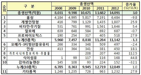 22일 식약처는 2012년 건강기능식품 생산실적을 분석한 결과를 발표했다.