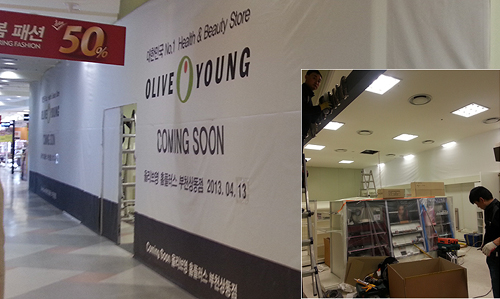1층에는 CJ올리브영이, 동시에 3층에는 약국이 13일 오픈을 앞두고 막바지 공사가 한창이었다.