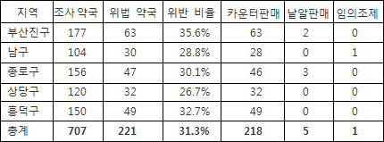 이번 전수조사는 3개 지역 총 707개 약국을 대상으로 진행됐으며, 221개(31.3%) 약국에서 약사법 위반 사실을 확인했다.
