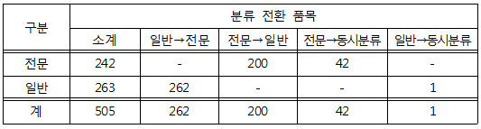 일반약에서 전문약으로 전환되는 품목은 262개, 전문에서 일반약으로 변경되는 품목은 200개다. 전문-일반 동시 분류 품목은 43개다.