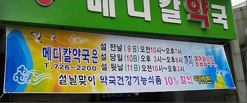 약사는 약국 앞 현수막을 통해 설 연휴 기간 약국 오픈 날짜와 시간, 명절 이벤트 사실을 고객들에게 공지하고 있다.