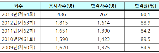 제64회 약사국시 경우 전체 436명의 응시자 중 262명이 합격, 60.1%의 합격률을 보였다.