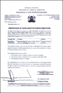 한국유나이티드제약에 대한 케냐 의약품 위원회의 GMP 인증은 2015년 7월 31일까지 유효하며, 매 3년 단위로 갱신하게 된다. 인증 범위는 항암제를 포함한 모든 액상제, 정제 및 캡슐에 대한 의약품 제조 활동이다.