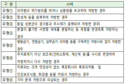 문제 처방 유형은 ▲의약품의 허가범위를 벗어난 처방 ▲항생제 등을 중복 처방 ▲동일 성분군의 경구용과 주사제의 중복처방 등이다.