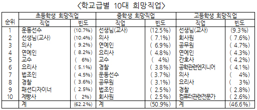 학생들의 희망직업을 보면 초등학생은 운동선수(10.7%), 교사(10.4%), 의사(9.2%), 연예인(8.2%), 교수(6%) 순으로 희망직업을 선택했다.
