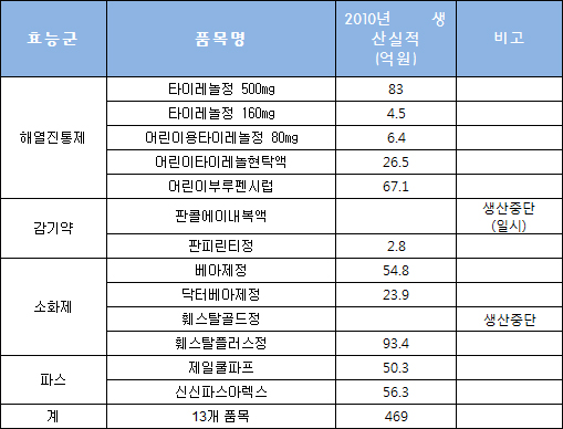 또 타이레놀500mg(83억여원), 어린이부루펜시럽(67억여원), 신신파스아렉스 (56억여원), 베아제정(54억여원), 제일쿨파프(50억여원) 등 50억이 넘는 대형품목도 적지 않다.
