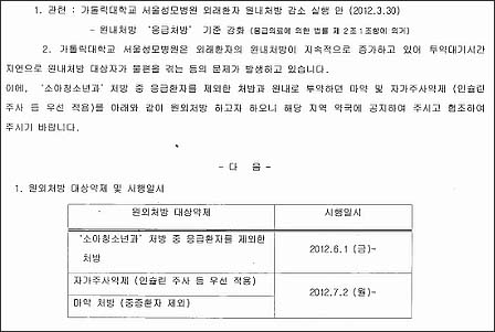 서울성모병원이 원외처방으로 전환하기로 것은 소아청소년과 처방 가운데 응급환자를 제외한 약제와 원내에서 주로 투약해 온 마약류와 자가주사약제 등이다.