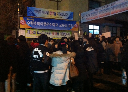 17일 제 63회 약사국시가 치러지는 서울 광장중학교에는 이른 아침부터 약대생과 약대 교수, 약사회 임원들이 대거 나와 약사국시 응시생들의 합격을 기원했다.