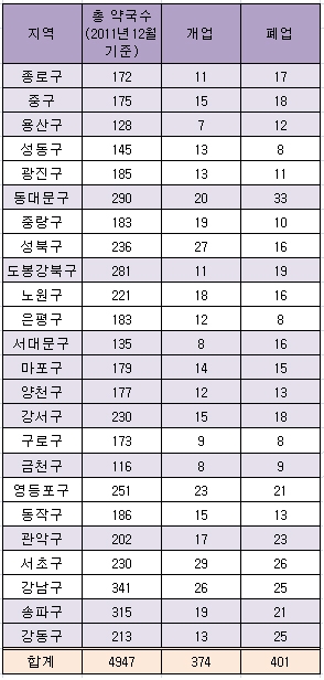 - 종로구·중구·용산구·동대문구 약국 폐업률 높아