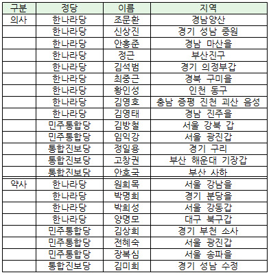 먼저 약사출신은 예비후보자를 보면 현역 비례대표 의원들의 지역구 출마가 눈에 띈다.