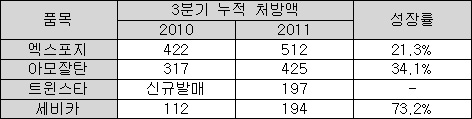 세비카(대웅)와 트윈스타(유한)의 놀라운 상승세는 리딩품목 엑스포지와 아모잘탄을 충분히 위협하고 있는 상황이다.
