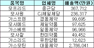 모프리드와 모사원에 비하면 다른 제약사의 제품들은 10억 미만 매출로 대동소이했다. 경동제약의 '가스프렌'은 9억 9695만원, 제일약품의 '모사메드'는 9억7625만원, 일동제약 '가스베트'는 9억 6966만원을 기록했다.