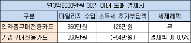 반면 이 약국이 같은 방식으로 기업구매전용카드 결제시에는 마일리지에 추가 소득세가 부과되더라도 세제혜택으로 실 추가부담액은 -54만원이 된다. 총 결제금액인 3억6000만원의 0.5%인 180만원 만큼, 세제혜택을 받기 때문이다.
