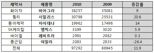 한편, 내년 비아그라 물질 특허 만료에 맞춰 상당수 제약사들이 제네릭 출시를 준비하고 있어 내년 하반기 발기부전치료제 시장은 춘추전국시대가 올 것으로 전망된다.