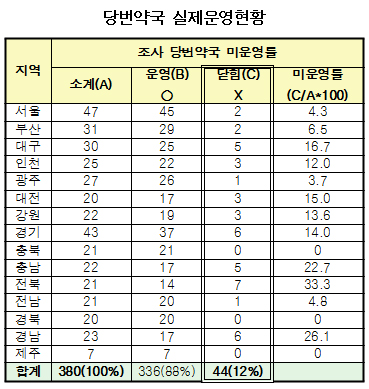 경실련이 이 가운데 380개를 직접 방문해 실제 운영여부를 조사한 결과 12%인 44개 약국이 당번약국을 운영하지 않고 있었다.