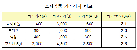 ◆가격 격차 약국별 최대 2.5배…표시 위반 92%인 약국도= 당번약국에서 판매되고 있는 상비약 가운데 타이레놀500mg와 크리맥, 속청과 후시딘을 직접 구입해 약국별 가격을 비교한 결과 동일 의약품 가격이 최대 2.5배 벌어진 채 판매되고 있었다.