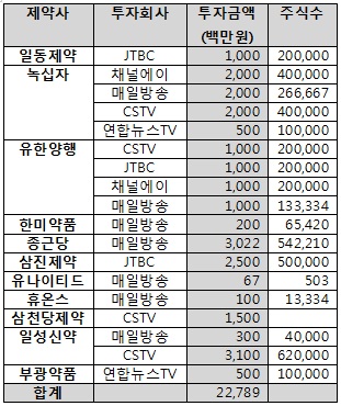 국감 자료에 따르면, 종편 4개 채널과 연합뉴스에 투자한 제약사는 일동제약, 녹십자, 유한양행, 한미약품, 종근당, 삼진제약, 유나이티드제약, 휴온스, 삼천당제약, 일성신약, 부광약품 등 11곳이다.