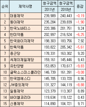 반면 오리지널 의약품을 보유한 노바티스, 화이자 등 다국적사들은 양호한 성장세를 이어갔고 한림제약, 유나이티드제약 등 국내 중견사도 청구액이 급증했다.