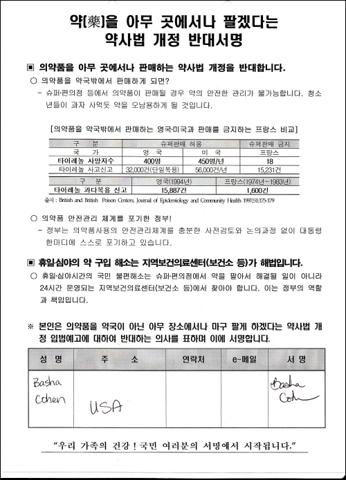 제주 지역의 O약사는 친분있는 외국인들에게 일반약 슈퍼판매의 위험성을 알리면서 서명을 받기도 했다.