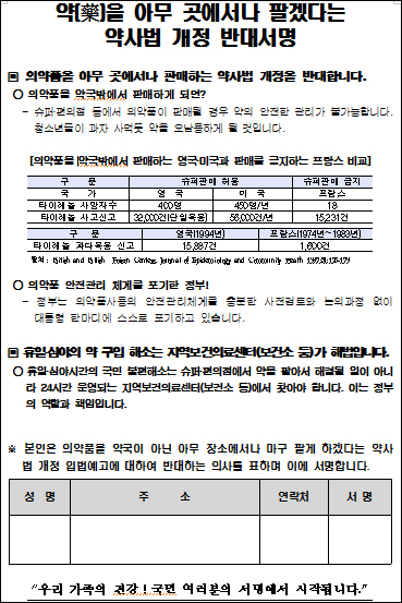약사회 관계자는 "약국 당 50건의 서명을 받는 것이 어떻게 보면 힘들지만 달리 생각하면 많은 수치도 아니다"며 적극적인 참여를 주문했다.