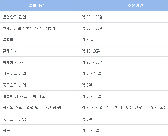 이후 차관회의와 국무회의 심의에 약 15일이 소요되고 대통령 재가에 이은 국회제출에 약 7일 정도가 걸린다.