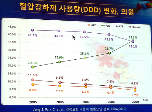 이 위원은 "개별 혈압강하제의 가격은 감소했으나 고가인 안지오텐신 수용체 차단제(ARB) 처방이 증가하면서 약품비 변동의 결정적 요인이 됐다"며 "2005년을 기점으로 칼슘채널차단제(CCB)에서 ARB로 처방이 전환되고 있다"고 설명했다.