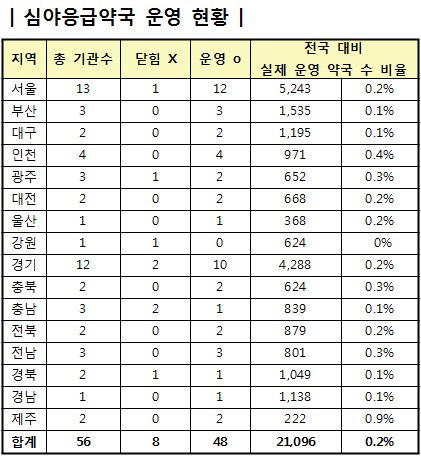 심야응급약국 가동률 0.2%…강원은 아예 없어