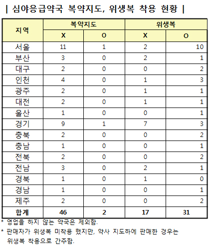 조사결과는 경실련이 지난 3일부터 14일까지 현재 운영 중인 전국 심야응급약국 총 56곳과 당번약국 119곳을 모두 방문해 비공개 조사한 것이며, 까스활명수와 겔포스엠 등 의약품 구매를 통해 약사의 복약지도와 약사가운 착용 행태 등도 대상에 포함됐다.