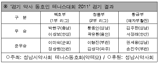 경기 성남시약사회(회장 김범석) 테니스동호회(회장 권세웅·이하 약테모)는 3일 성남시립테니스장에서 테니스 동호인 50여명이 참석한 가운데 '경기 약사 동호인 테니스 대회 2011'를 개최했다.