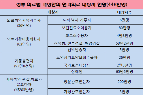 복지부는 의사와 환자간 원격진료 허용대상으로 의료취약지역 거주자 86만명, 의료기관 이용제한 자 63만명, 거동불편자 93만8천명, 계속적인 관찰이나 치료가 필요한 자 203만명 등 총 446만명을 추산한 바 있다.
