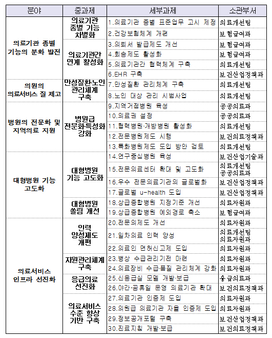 의원의 경우 만성질환 관리체계 구축-노인.소아 등 관리확대 방안이, 병원은 거점육성과 전문병원-특화병원화, 상급종합병원은 전문의료센터-글로벌화 가 목표로 제안했다.