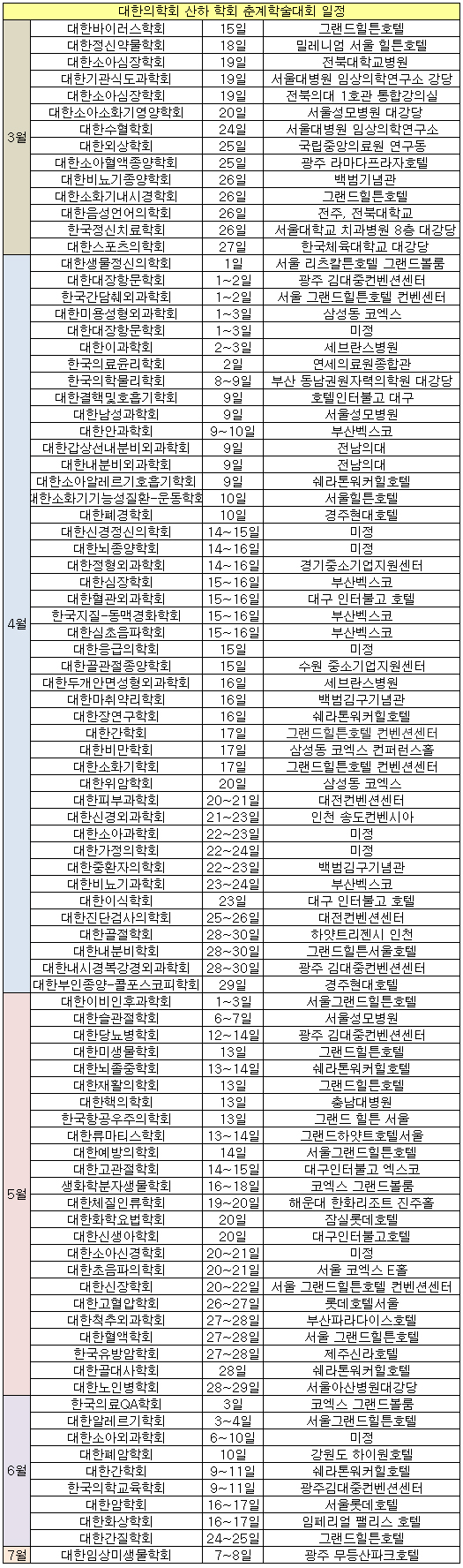 춘계학술대회는 대부분 4, 5월에 집중됐으며, 안과학회, 간학회, 소화기학회, 피부과학회 등 대규모 학회는 4월에 집중된 것으로 분석됐다.