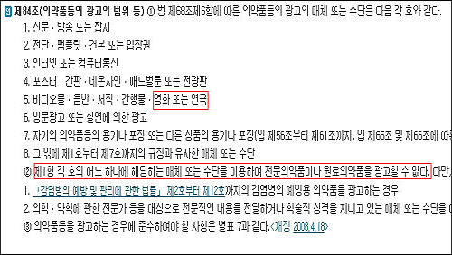 식약청관계자도 이 관계자와 뜻을 같이했다. 식약청 의약품안전과 관계자는 "현재까지 영화에서 표현되는 의약품 광고에 대한 처벌은 물론 합의 과정도 없었다"며 "특히 표현의 자유가 문제되는 만큼 사회적인 합의가 필요하다"고 전했다.