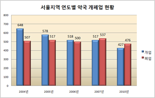 구약사회가 파악한 약국 개·폐업 현황을 기준으로 지난 2005년의 경우 한 해 동안 서울지역 약국은 61곳이 순수하게 증가했지만 2006년에는 18곳이 증가하는데 그쳤으며 이후에는 감소세로 전환돼 2007년 20곳, 2009년 27곳, 2010년 49곳이 줄어들었다.