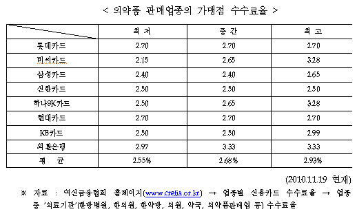 약사회가 복지부에 제시한 자료를 보면, 의약품 판매업종의 가맹점 수수료율은 최저 2.15%, 최고 3.33%까지 카드사에 따라 천차만별이다. 평균중간값은 2.68% 내외다.
