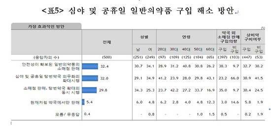 심야 및 공휴일 일반약 구입 불편 해소방안으로는 ‘안전성이 확보된 일반약 소매점 판매’(32.4%), ‘심야 및 공휴일 당번약국 확대시행’(32%) 등으로 분포했다.