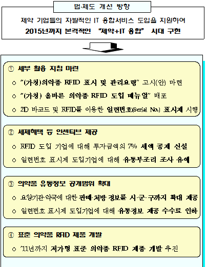 또한 정부는 제약사들의 RFID 도입을 돕기 위해 앰플, PTP, 포장, 수액제, 주사팩 등 의약품 유형별로 표준화된 태크를 개발 제공하고 세부활용 지침도 마련한다는 계획이다.