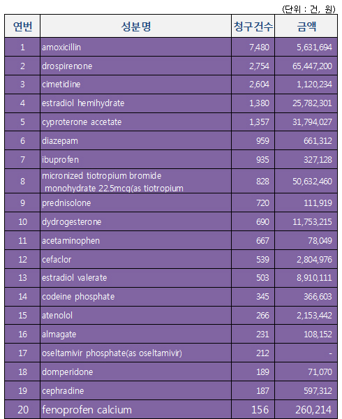 한편 성분명 청구건수는 명세서 건수 합계로 금액은 청구금액을 더한 값이다. 청구건수의 경우 해당기관의 명세서 내에 성분명으로 기재한 내역이 여러개일때 각각 산정됐다.
