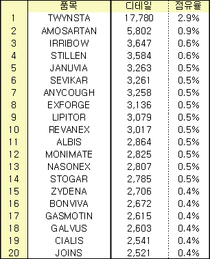 이밖에 스티렌, 자누비아. 애니코프, 엑스포지, 리피토, 레바넥스 등이 디테일 상위권에 포진했다.