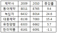 동아제약과 녹십자의 2010년 매출 순위가 지난해에 이어 1위, 2위가 확정적인 가운데 3위부터 순위 변동이 예상된다.