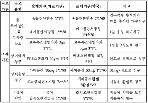 카네스텐크림을 카네스텐질정으로, 세파클럽건조시럽을 세파클러캅셀로 청구하는 등 실제 처방과 다른 약제의 청구, 사미온정10mg를 30mg로 청구하는 상이용량 청구도 대표적인 착오청구 사례로 제시됐다.