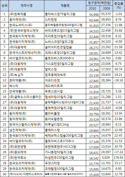 이밖에 비소세포폐암치료제 ‘이레사’는 임상적 유용성을 입증한 임상결과가 발표된 여파로 청구액 83억원, 43.1% 성장세로 반등했고, 혈우병약 ‘리콤비네이트’를 대체한 ‘애드베이트’는 청구액 221억원으로 14위에 새롭게 이름을 올렸다.