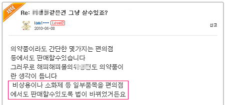 A사이트 정보 공유란을 보면 "의약품이라도 간단한 몇 가지는 편의점에 등에서 판매할 수 있다. 비상용이나 소화제 등 일부 품목을 편의점에서도 판매할 수 있도록 법이 개정됐다"는 내용이 게시됐다.