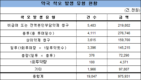 의료기관과 약국이 지난해 6개월간 처방·조제내역을 착오청구한 건수는 총 1만9047건으로 비급여 약제 등을 급여로 잘못 청구한 사례가 가장 빈번한 것으로 드러났다.