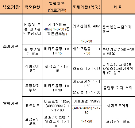 의료기관의 경우 ▲처방약제 누락 ▲삭제 약제코드 및 약제코드 착오 ▲안약·연고·호르몬제 등의 용량이나 포장단위 착오 ▲대체조제 후 미수정 또는 상이약제 기재 등이 빈번했다.