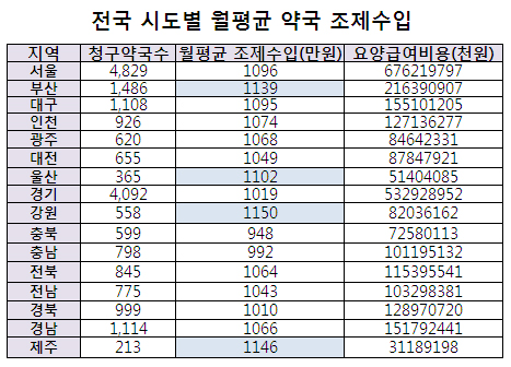 급여비 청구 약국 수가 전국에서 가장 적은 213곳에 불과한 제주도 지역 또한 월 평균 1146만원의 조제수입을 올려 최고 대열에 올랐다.